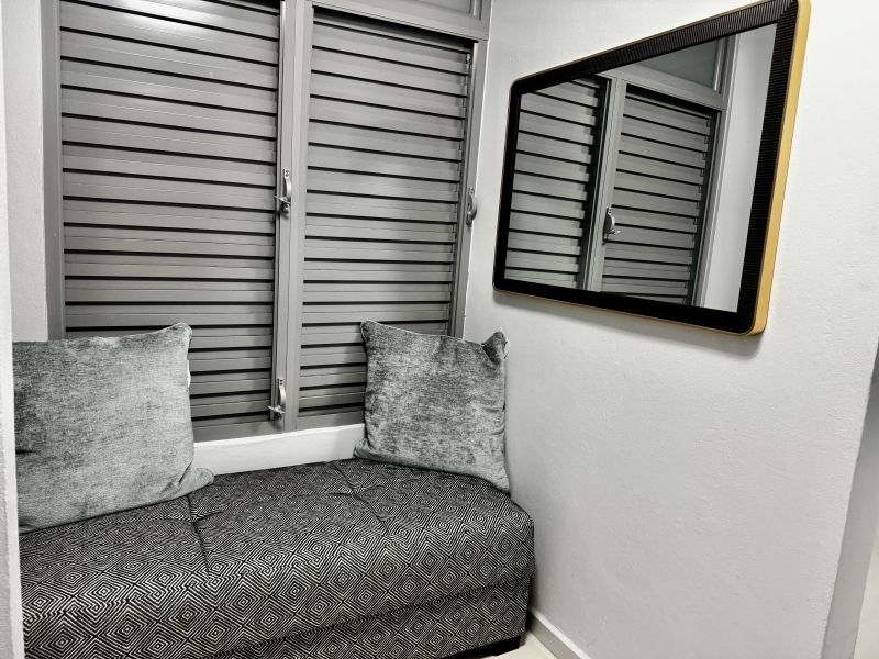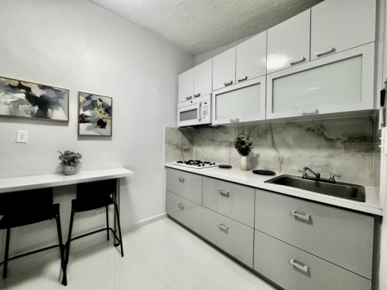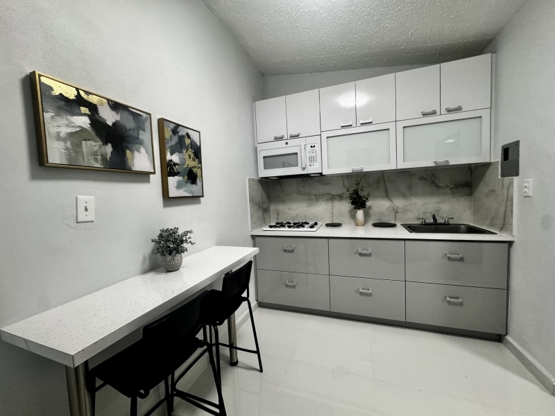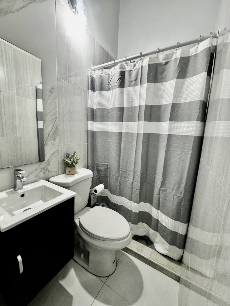 Descripción: Apartamento en 1er piso de 1 habitación con cama Full, tiene closet-oficina. Todo es nuevo. La habitación tiene aire acondicionado Split Unit. Una cocina moderna muy bien equipada con todos los utencilios, juego de ollas, vajilla, cuchillos, nevera, tope de estufa de gas, microondas. Baño amplio con calentador de agua. El comedor, y la cocina tienen aire acondicionado. Area de laundry lavadora y secadora se utiliza monedas. Excelente para profesionales o pareja.