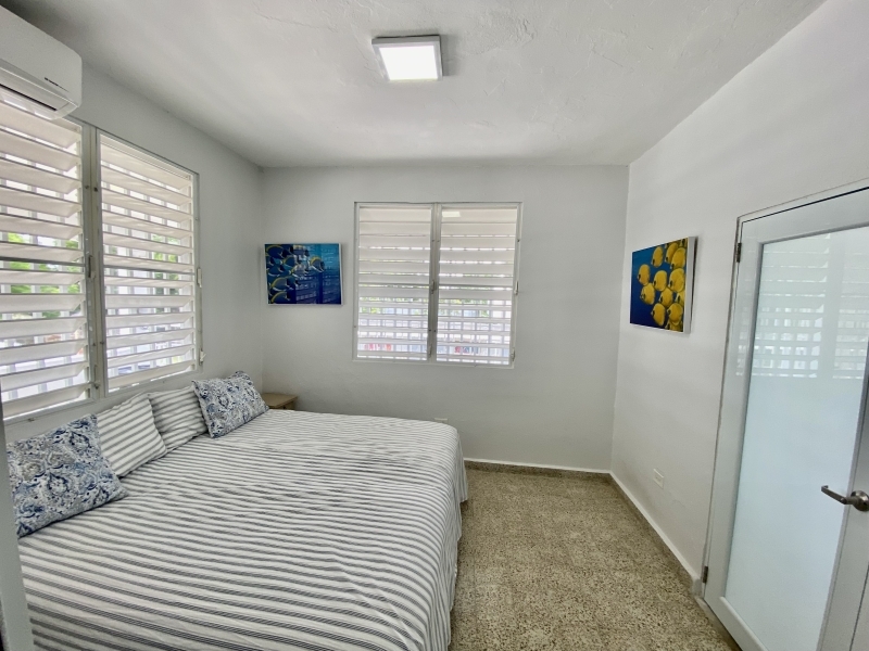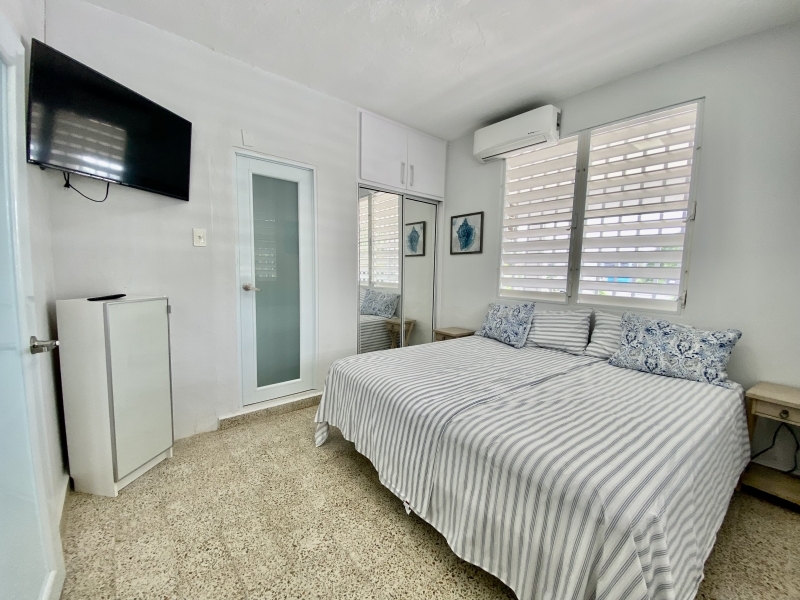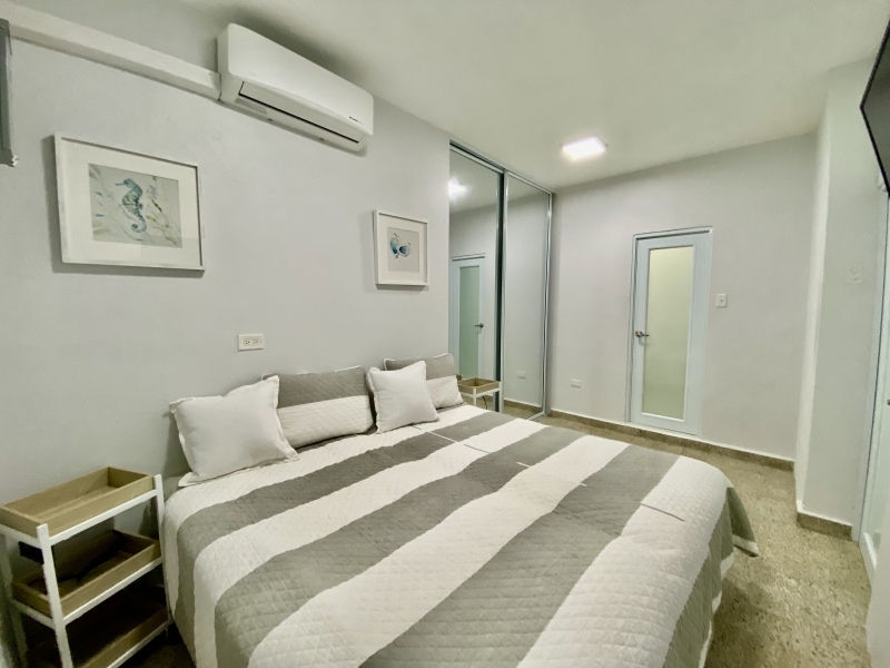 Descripción: Apartamento en 2do piso con balcón grande. Tiene  2 habitaciones con closet de puertas de espejo, las dos habitación con cama King, aires acondicionado Split Unit. Cocina moderna con aire acondicionado muy bien equipada con todos los utencilios, juego de ollas, platos, cubiertos,  cuchillos, y mas, nevera, tope de estufa, microondas. Sala amueblada. Area de Laundry lavadora y secadora, calentador de agua. Excelente para profesionales o grupo de estudiantes extranjeros. Estacionamiento bajo techo.