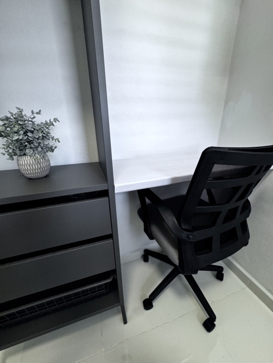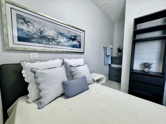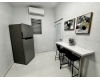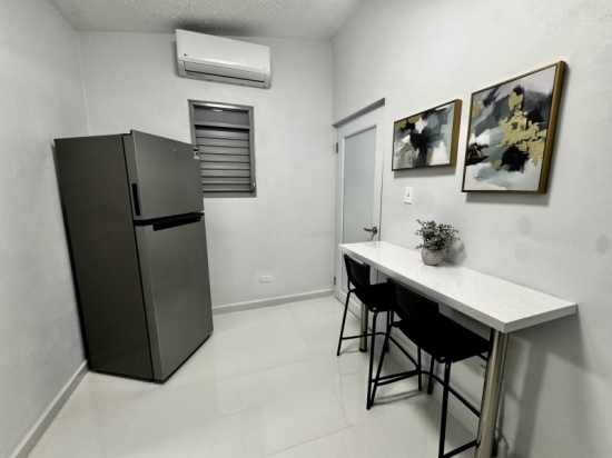 Descripción: Apartamento en 1er piso de 1 habitación con cama Full, tiene closet-oficina. Todo es nuevo. La habitación tiene aire acondicionado Split Unit. Una cocina moderna muy bien equipada con todos los utencilios, juego de ollas, vajilla, cuchillos, nevera, tope de estufa de gas, microondas. Baño amplio con calentador de agua. El comedor, y la cocina tienen aire acondicionado. Area de laundry lavadora y secadora se utiliza monedas. Excelente para profesionales o pareja.